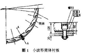 在簡體橫斷面上,沿筒體圓周有24塊小波形襯板一塊壓著一塊,格子型球磨機(jī)每塊用2只M36螺釘與筒體固定,相鄰倆塊在筒體長度方向上的間隙錯(cuò)開,格子型球磨機(jī)通過長期對其使用和失效情況的考察發(fā)現(xiàn),失效報(bào)廢幾乎都是因螺釘松動引起格子型球磨機(jī)筒體漏砂。