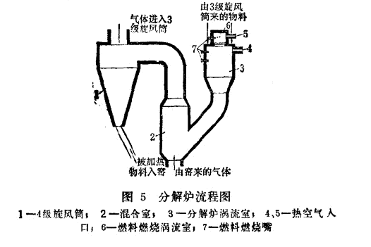 回轉(zhuǎn)窯機(jī)組的單位容積產(chǎn)量將增加1 -1.5倍,并能達(dá)到4噸每立方米·日,因此,旋風(fēng)預(yù)熱器窯安裝分解爐以后,無需增大回轉(zhuǎn)窯的外形尺寸,其產(chǎn)量就能提高200-250%。但是,卻必須改造預(yù)熱器來適應(yīng)增加的廢氣量。預(yù)熱器內(nèi)的分解爐是一個(gè)豎式反應(yīng)器,生料在其內(nèi)部以懸浮噴射層形式進(jìn)行分解。分解爐是兩個(gè)各自裝有混合器的室。分解爐裝置的流程示意圖為:
