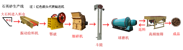 這套生產(chǎn)線有振動給料機(jī)、顎式破碎機(jī)細(xì)碎機(jī)、球磨機(jī)、提升機(jī)、振動篩皮帶輸送機(jī)等設(shè)備組合而成。